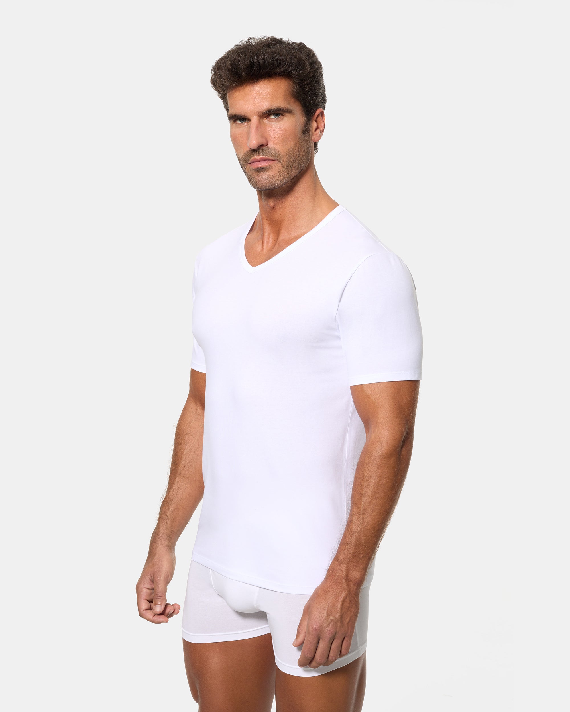 Men's white short-sleeved T-shirt with V-neck, designed with the innovative Regul'activ technology. This thermo-regulating system improves sweat distribution and accelerates moisture evaporation, adapting to body temperature variations. Thanks to its stretch cotton fabric, it fits the body like a second skin, offering comfort and freshness throughout the day.