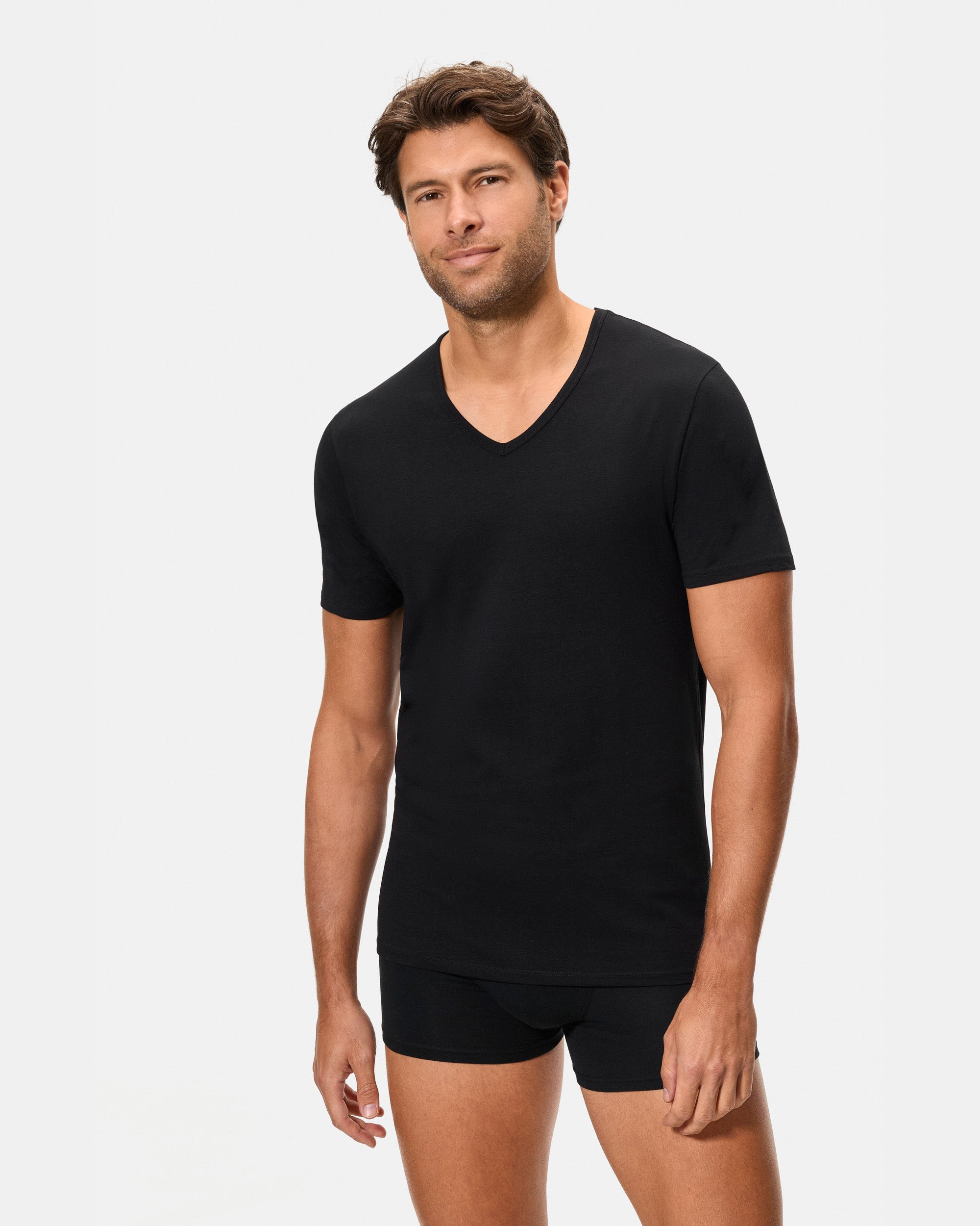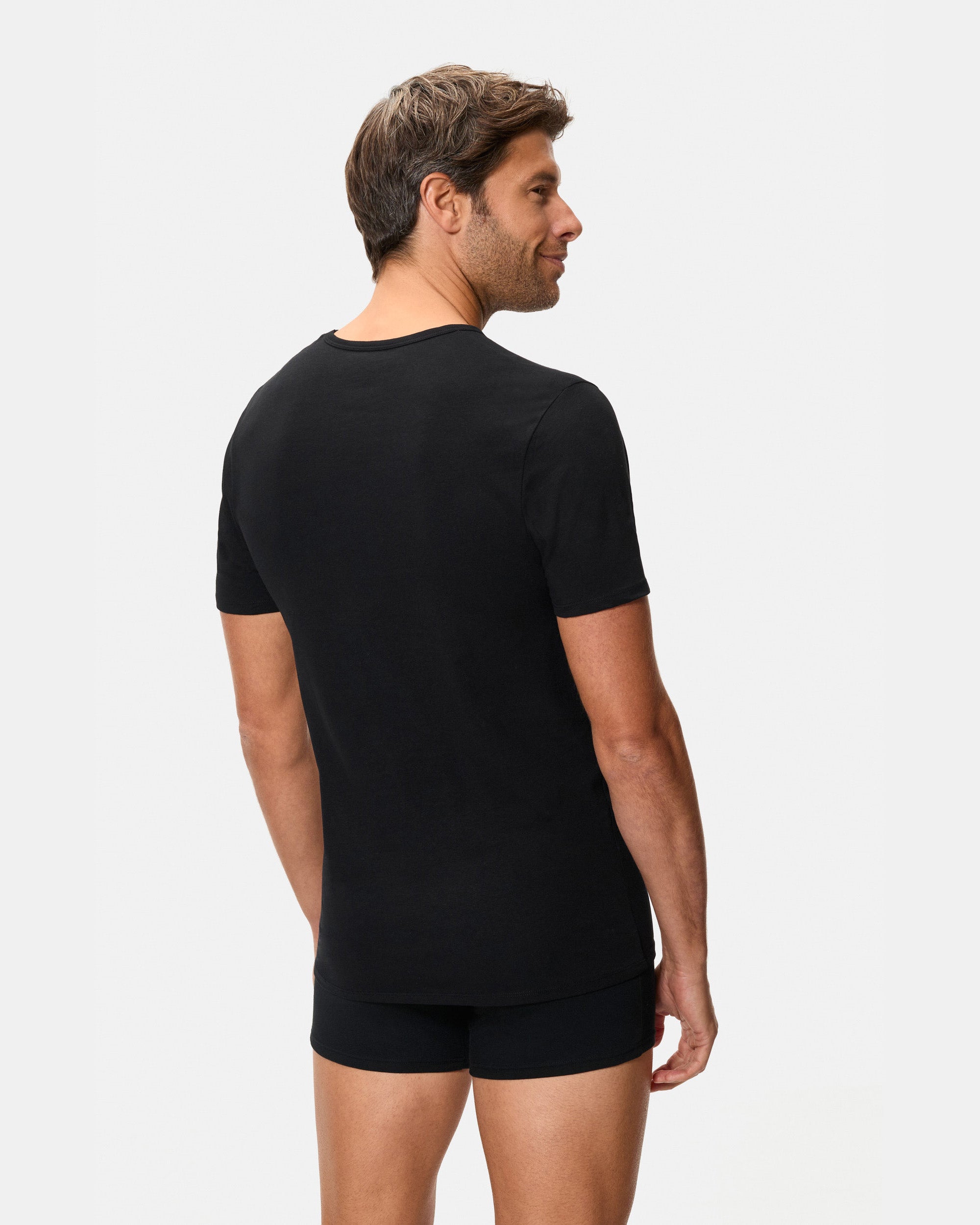 Men's black short-sleeved T-shirt with V-neck, made with stretch cotton and the innovative Regul'activ technology. This line favors sweat distribution and accelerates moisture evaporation thanks to its active thermo-regulating. Regul'activ's intelligent fabric automatically activates when your body temperature changes, adapting to your body like a second skin. It helps you stay dry, comfortable and flawless all day long.