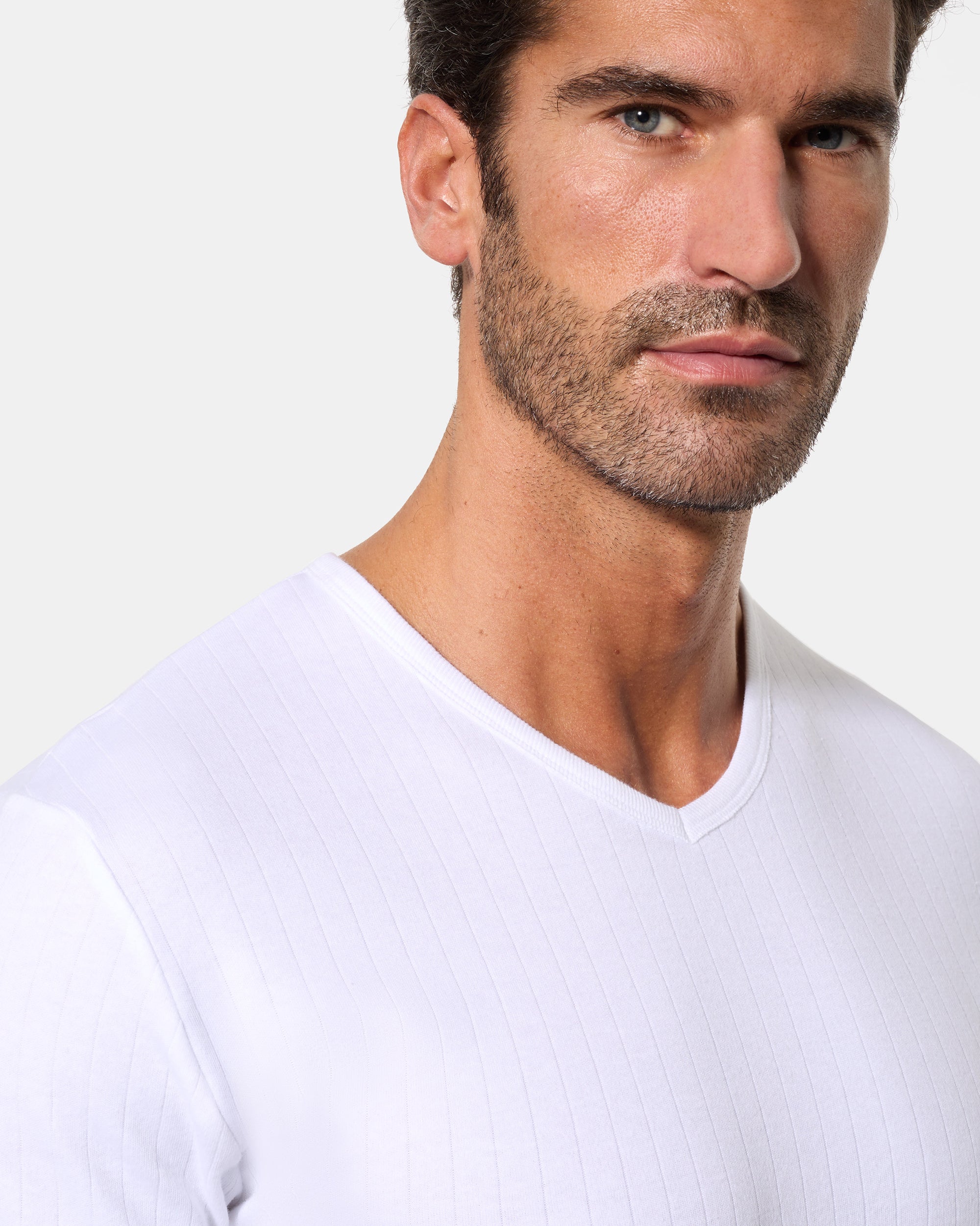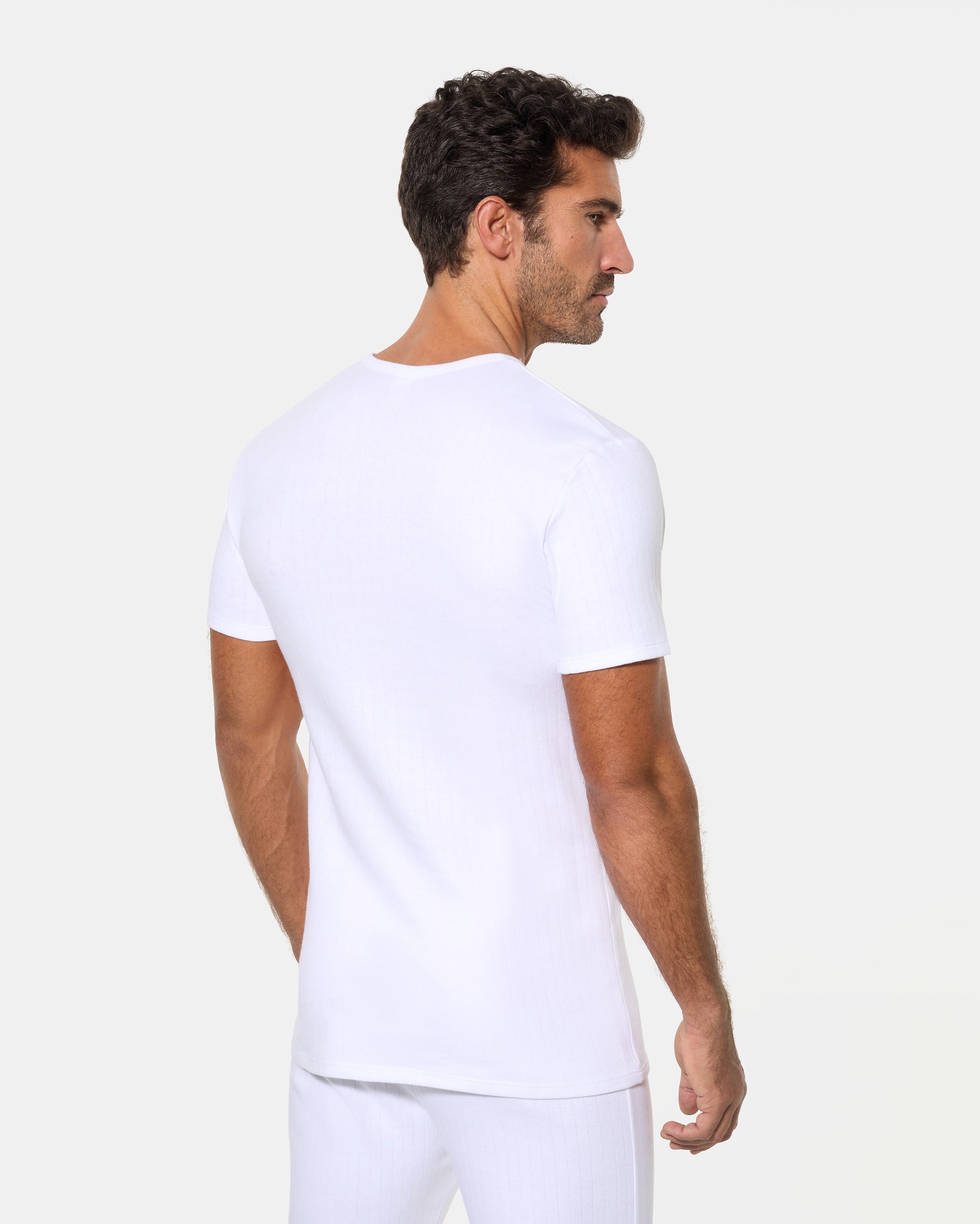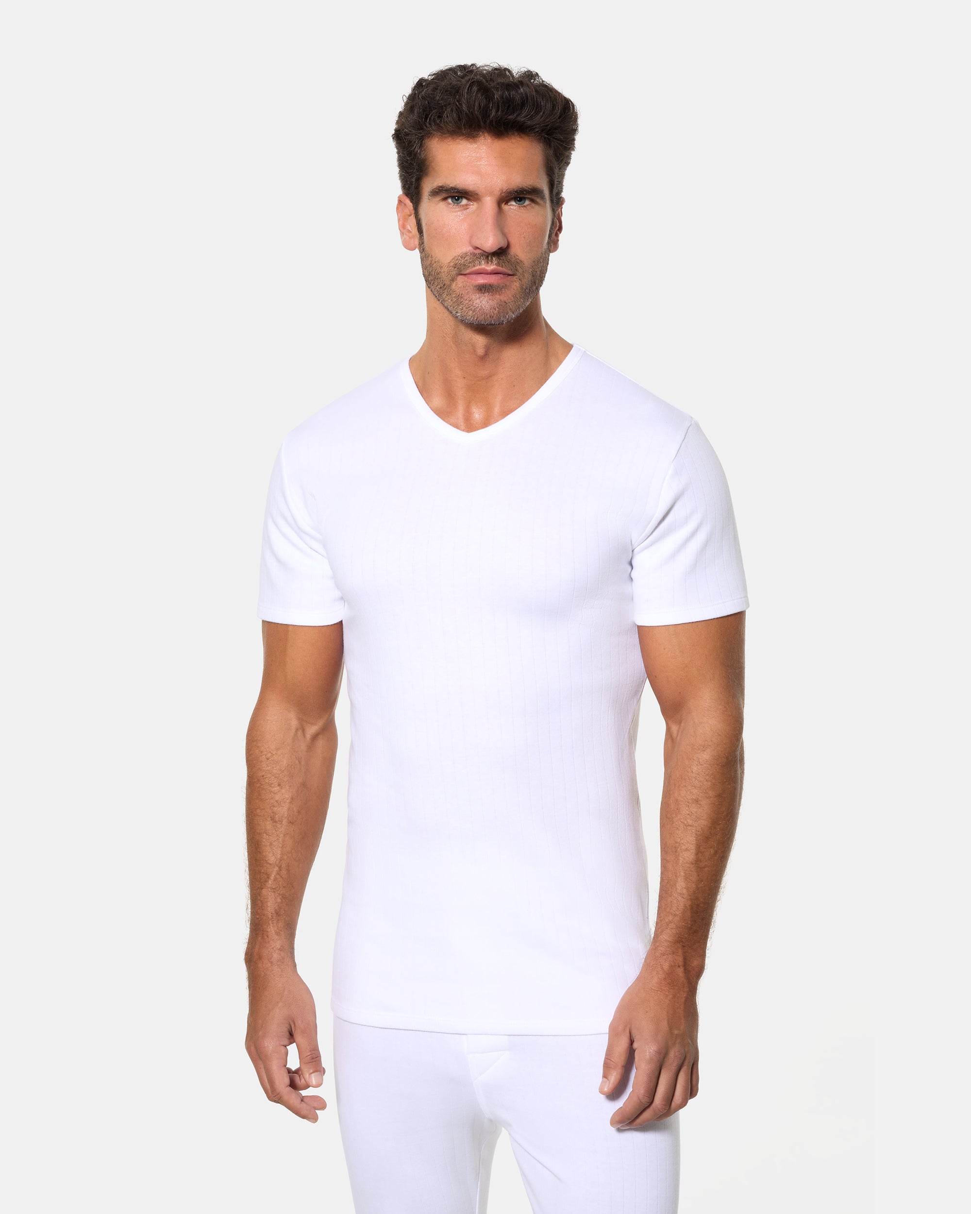 Men's short-sleeved V-neck thermal T-shirt, made with winter cotton in interlock drained fabric. The needles are removed to achieve a small pattern, providing exceptional softness to the touch. The plush interior offers extra warmth, ensuring a comfortable feel all day long.