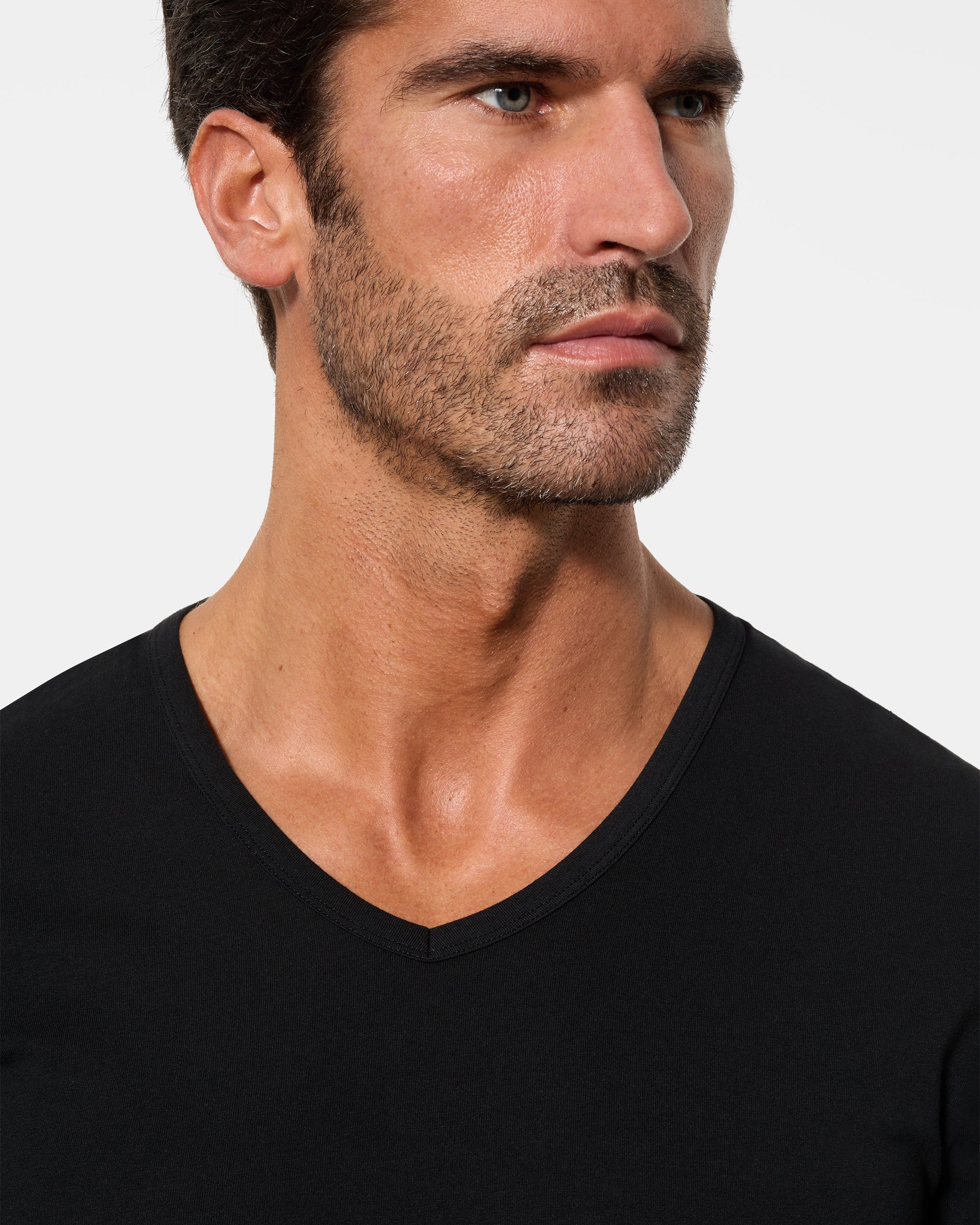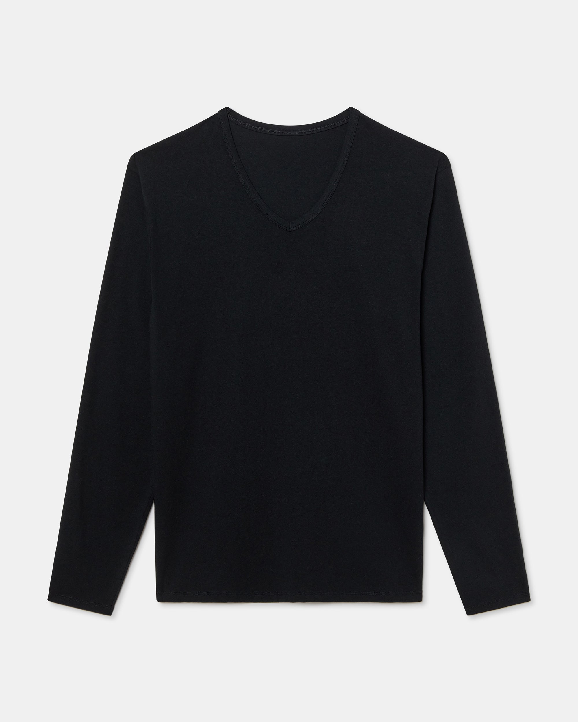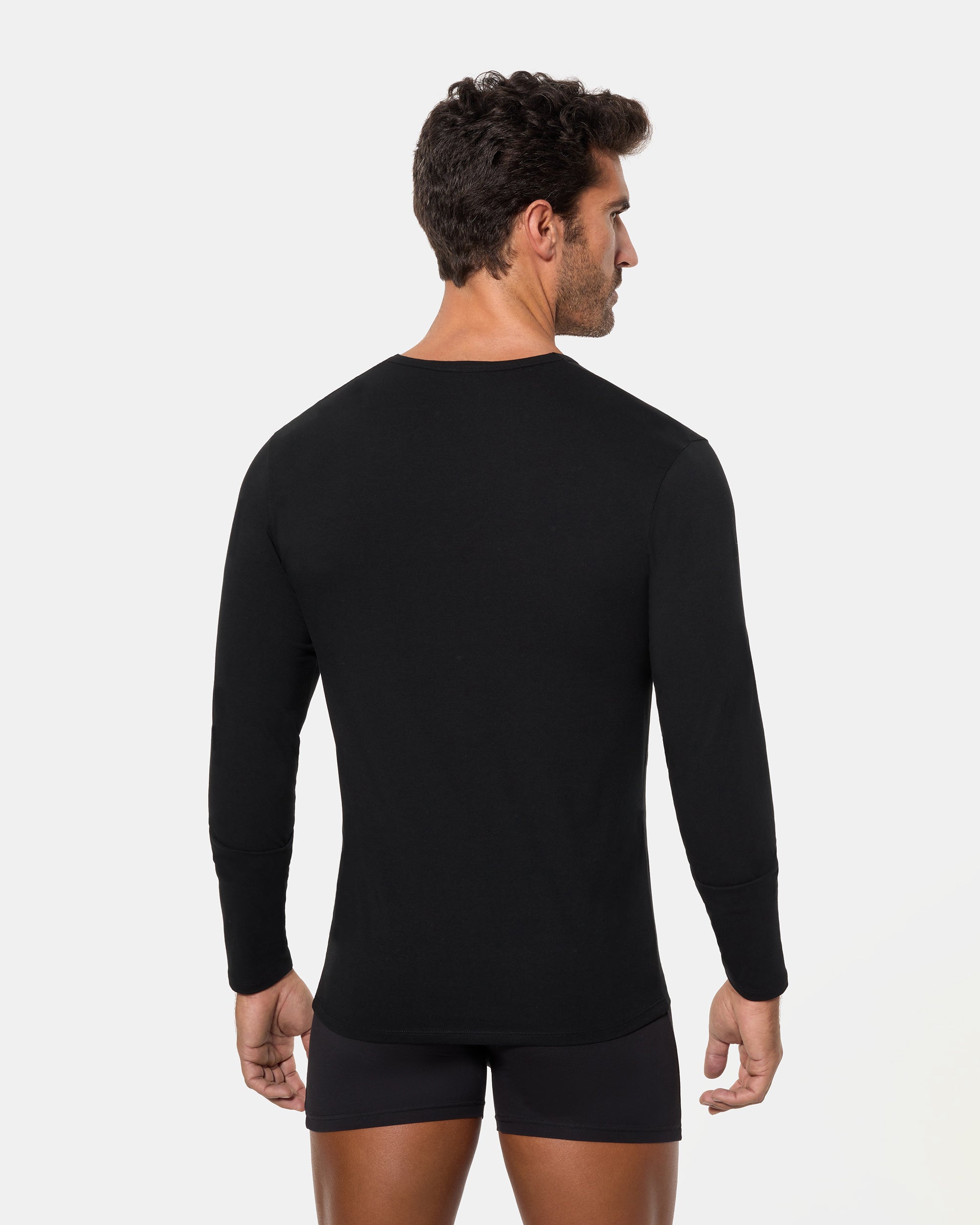 Camiseta de manga larga negra para hombre con cuello pico, fabricada con la avanzada tecnología Regul'activ que optimiza la distribución del sudor y acelera la evaporación de la humedad, adaptándose a los cambios de temperatura corporal. Gracias a su tejido de algodón elástico, se ajusta al cuerpo como una segunda piel, ofreciendo confort y frescura durante todo el día sin sacrificar la transpirabilidad.