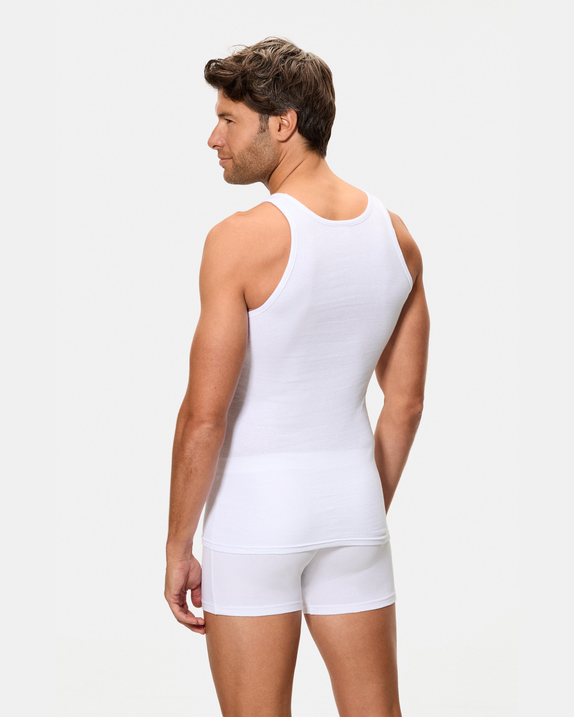 Camiseta de tirantes blanca para hombre, confeccionada en algodón 100% de alta calidad y con tejido canalé 2x2. Su diseño ofrece una comodidad y transpirabilidad excepcionales, adaptándose perfectamente al cuerpo. Ideal como prenda interior, proporciona un ajuste cómodo y fresco durante todo el día.