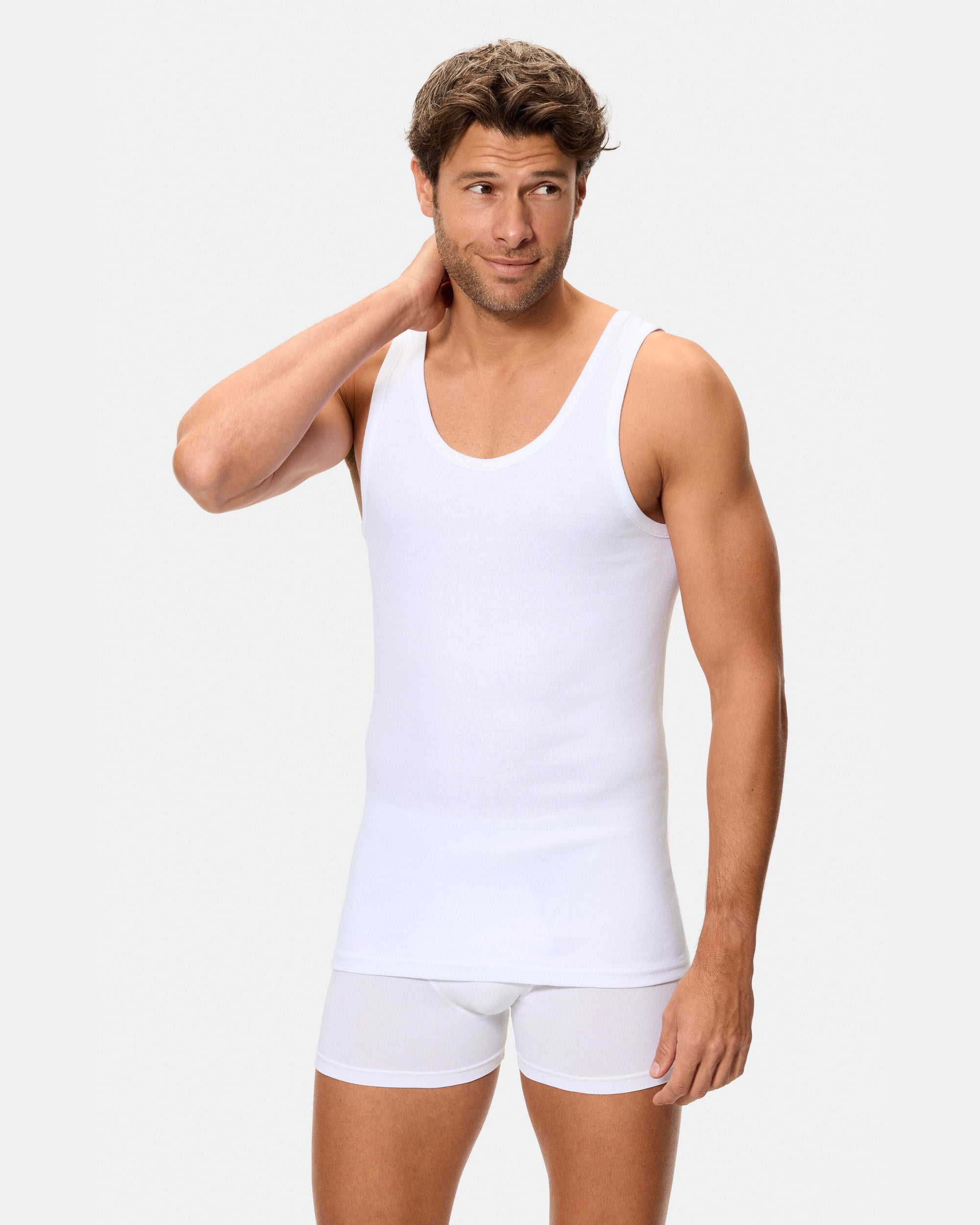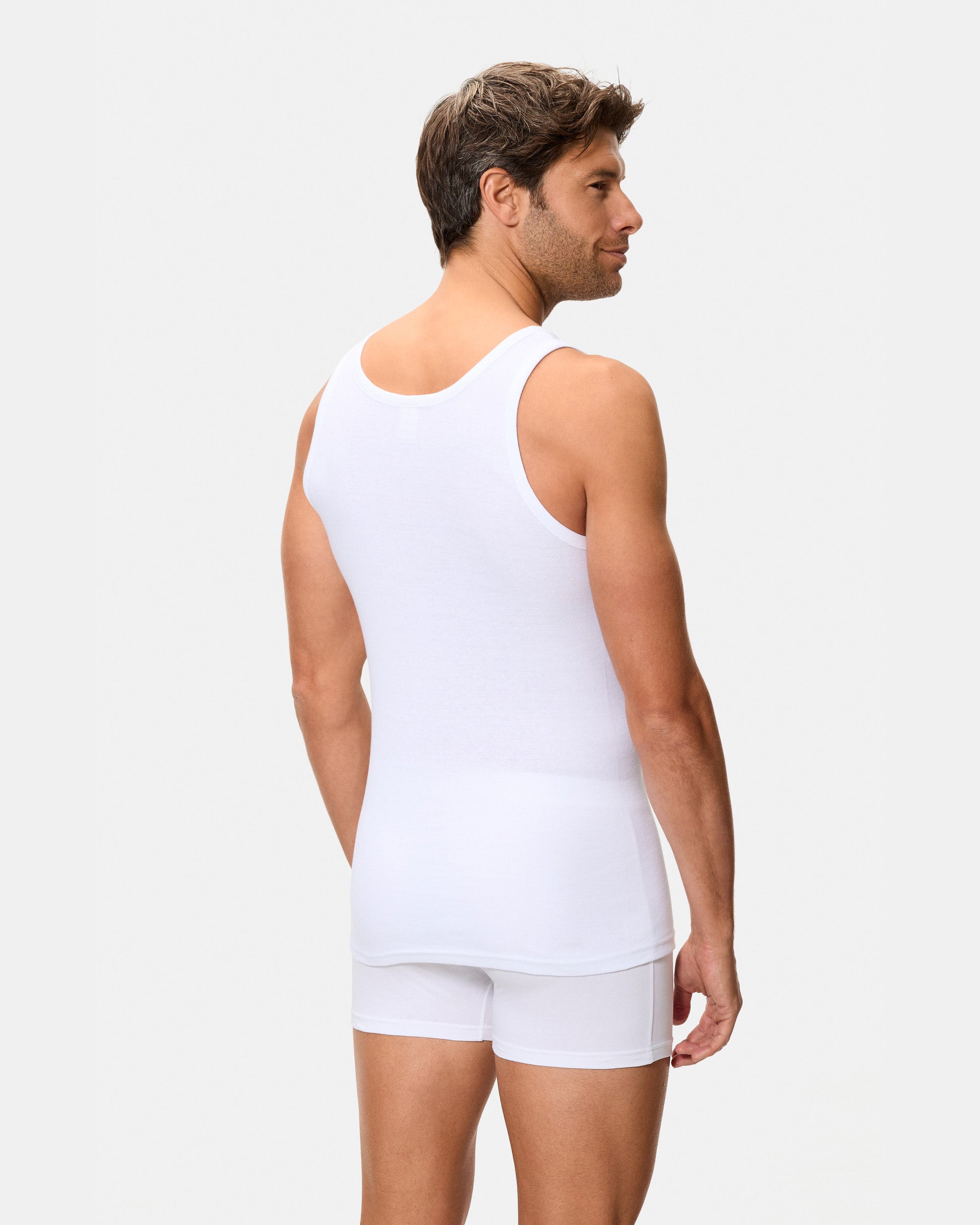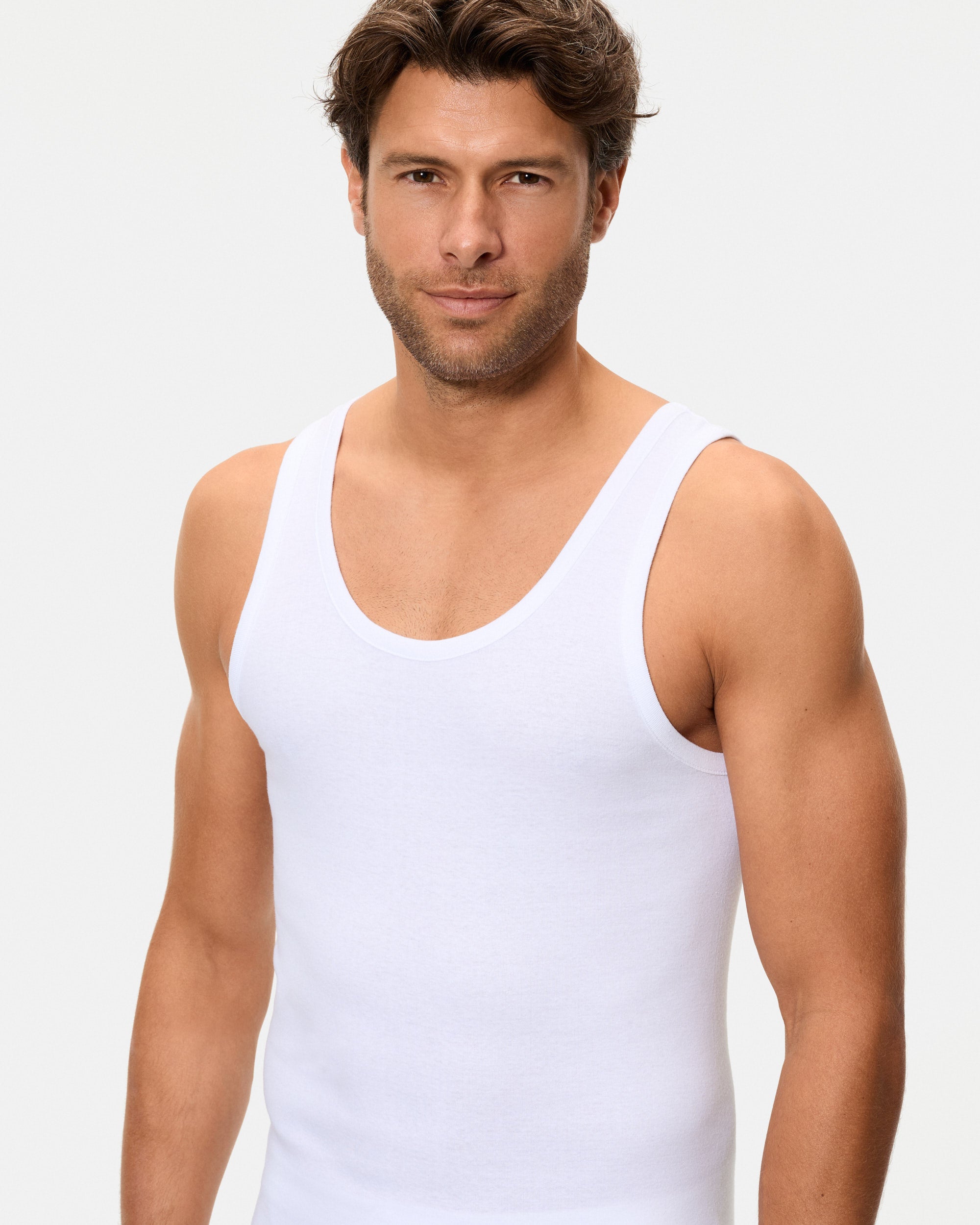 Camiseta de tirantes para hombre, confeccionada en algodón 100% de máxima calidad y tejido canalé 1x1. Este tipo de tejido es muy flexible, proporcionando un ajuste ceñido al cuerpo sin ser demasiado rígido. Además, su estructura canalé ofrece una excelente transpirabilidad y resistencia, lo que la convierte en una prenda cómoda y duradera. Su corte clásico y suave tejido garantizan una máxima comodidad y confort durante todo el día. Disponible en color blanco, es perfecta tanto para usar como prenda interior o para llevarla por fuera, siendo muy fácil de combinar con otras prendas.