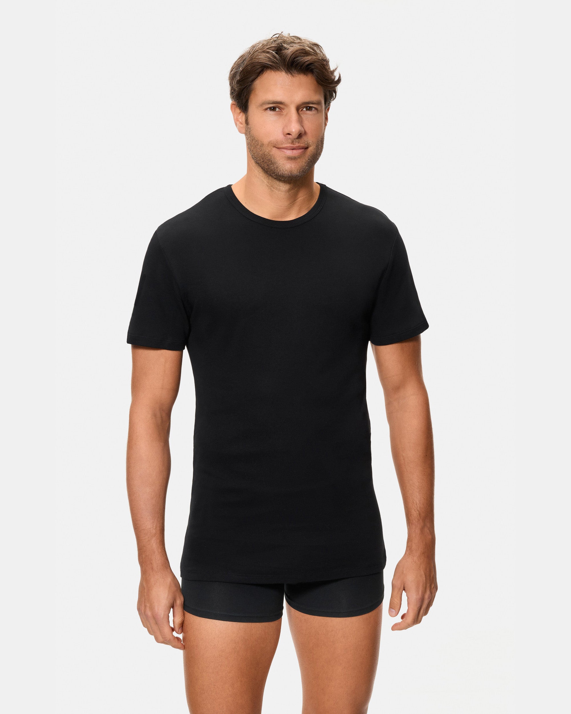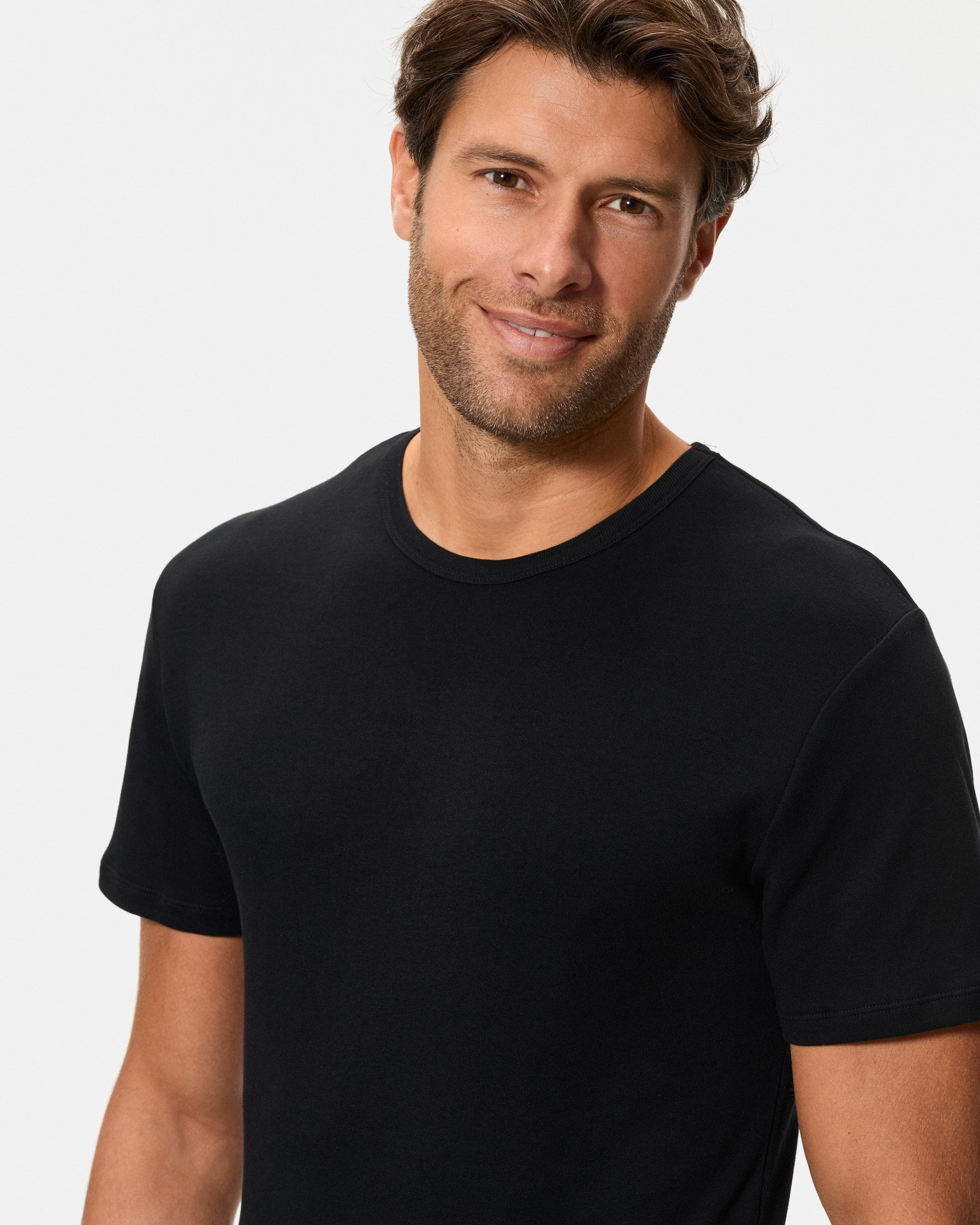 Camiseta térmica de manga corta y cuello redondo para hombre, fabricada en algodón 100% con tejido Interlock liso. Su interior afelpado mantiene el calor extra sin sacrificar la suavidad. El color negro es versátil y moderno, ideal para ser usado tanto como prenda interior como en un look más casual.