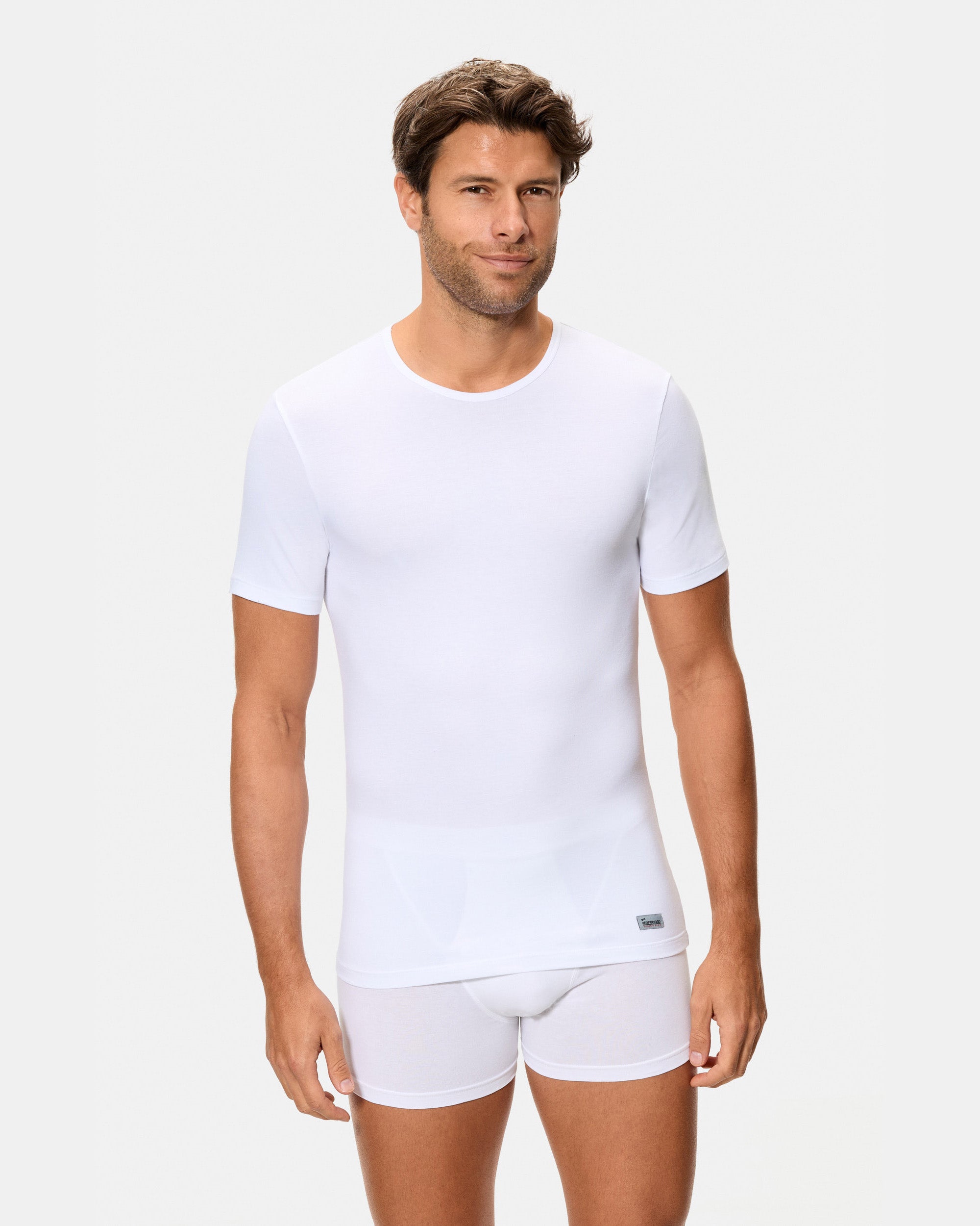 Camiseta térmica blanca de manga corta para hombre, diseñada con la innovadora tecnología Termaltech, que genera y retiene el calor en su interior. Con un tejido fino y ligero, ofrece calidez sin volumen adicional, asegurando una mayor comodidad y libertad de movimiento. Ideal para usarse debajo de la ropa, ya que no molesta ni crea incomodidad. Recomendada para climas fríos extremos, perfecta para actividades al aire libre como motociclismo, ciclismo y deportes de invierno.
