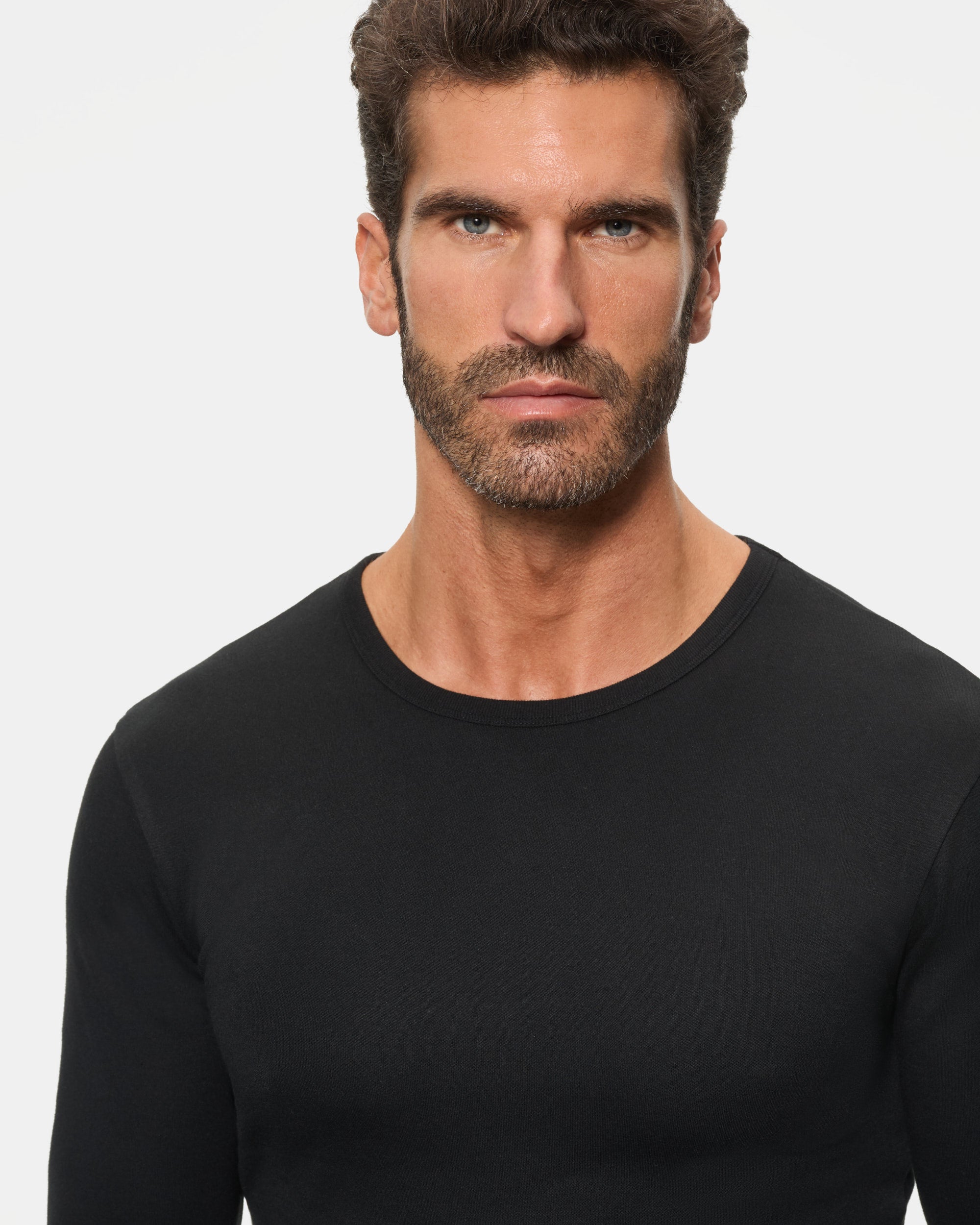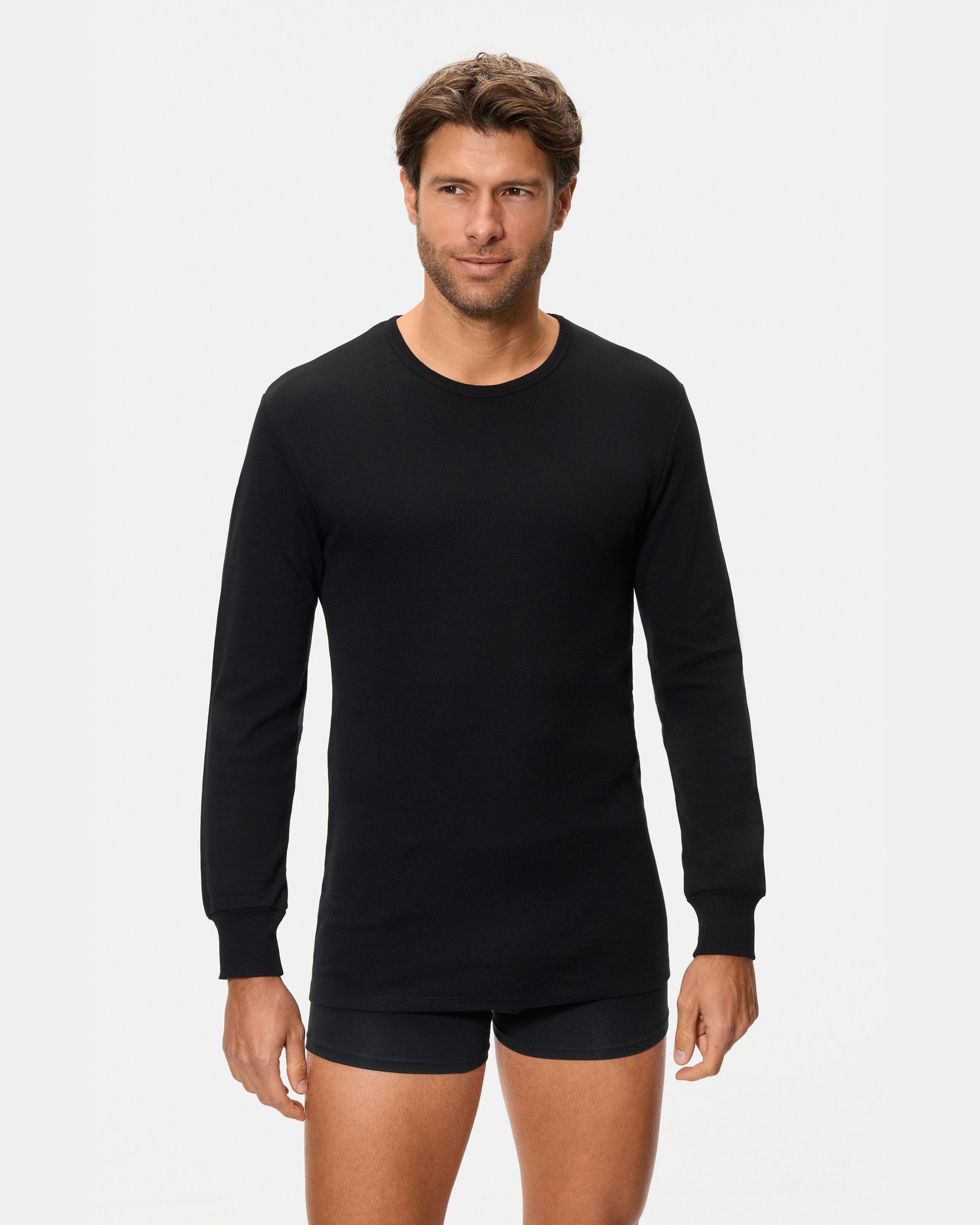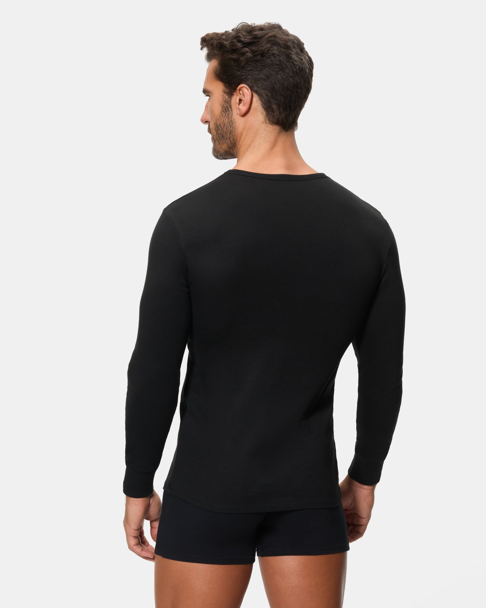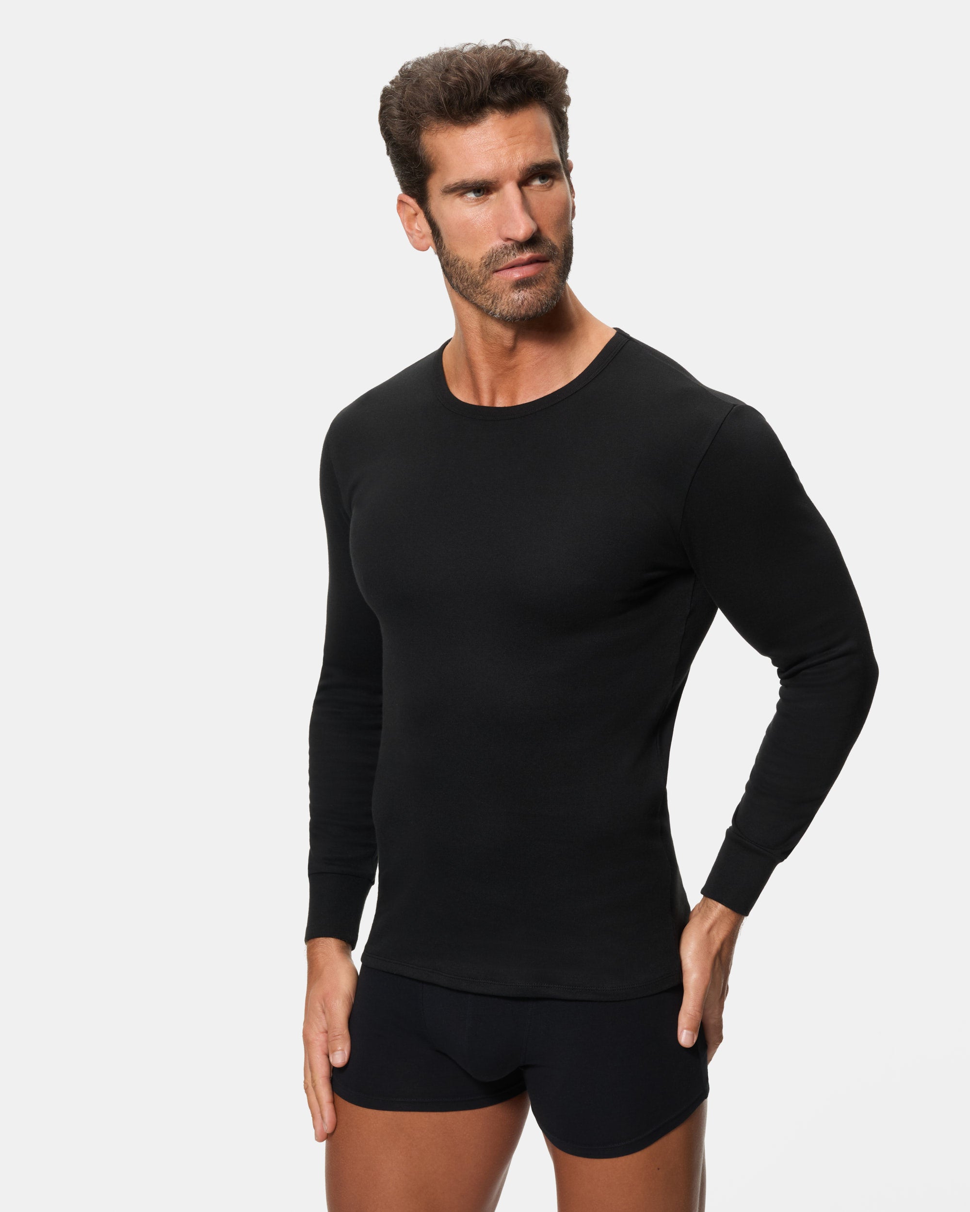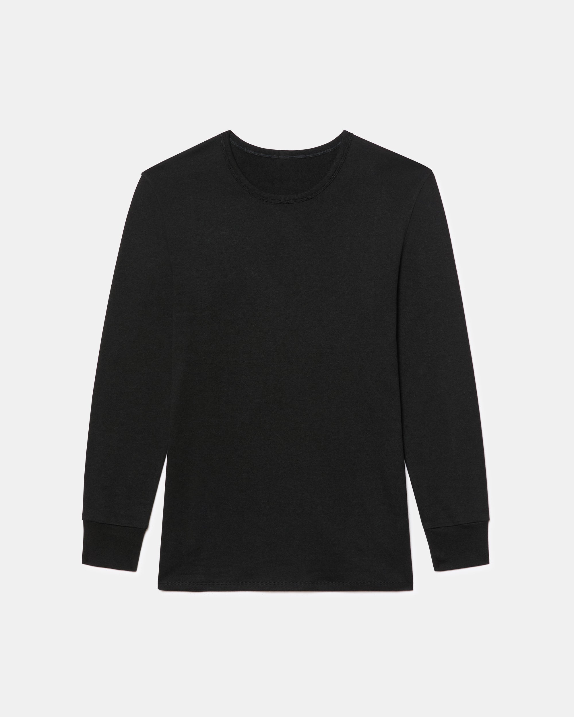 Camiseta térmica de manga larga y cuello redondo para hombre, confeccionada con algodón 100% y tejido Interlock liso. Este tejido de punto se caracteriza por su suavidad, elasticidad y alta durabilidad, gracias al proceso de entrelazado de hilos. Además, su interior afelpado proporciona un extra de calor, ideal para mantenerte abrigado y cómodo durante todo el día. El color negro es elegante y versátil, ideal para cualquier ocasión.