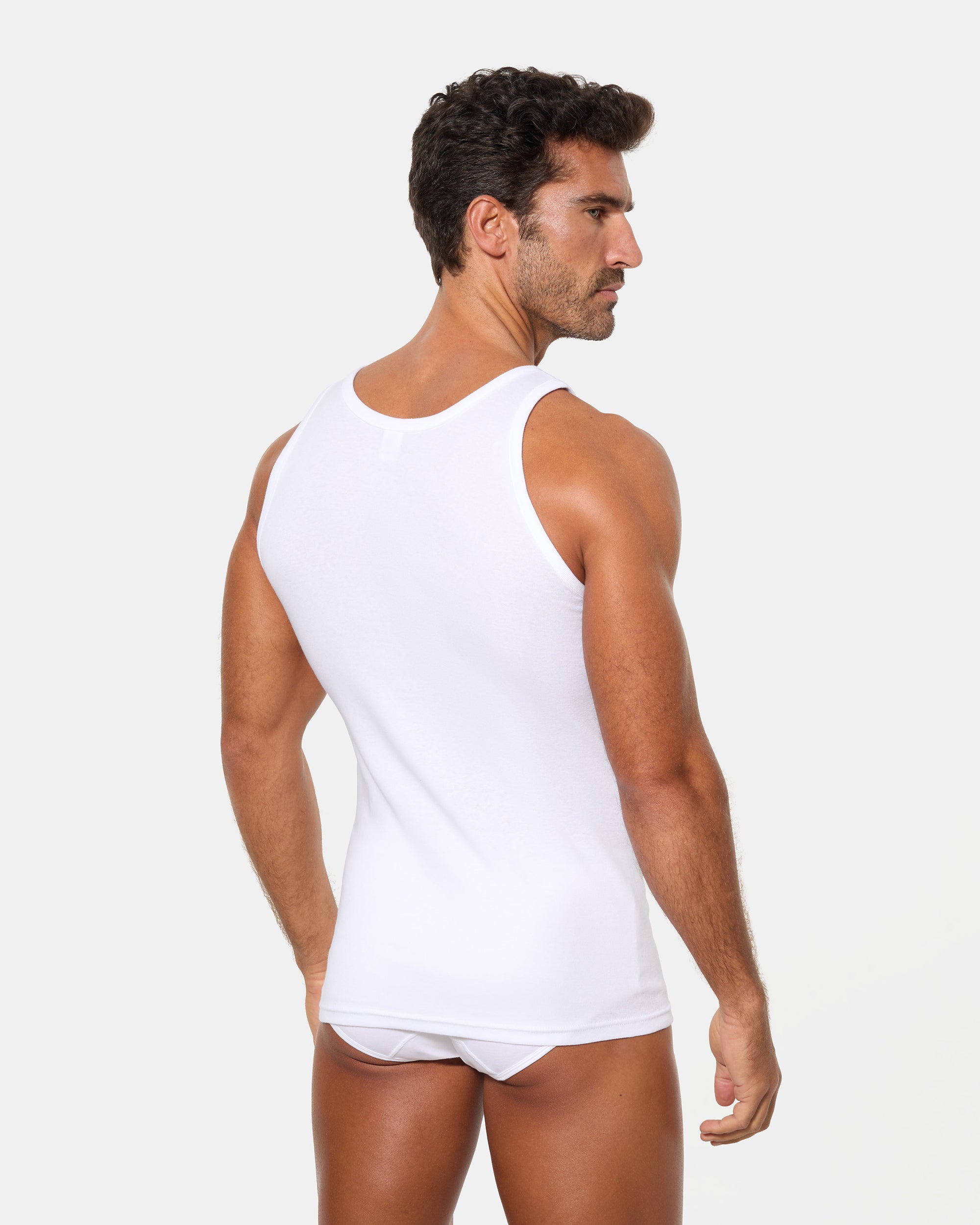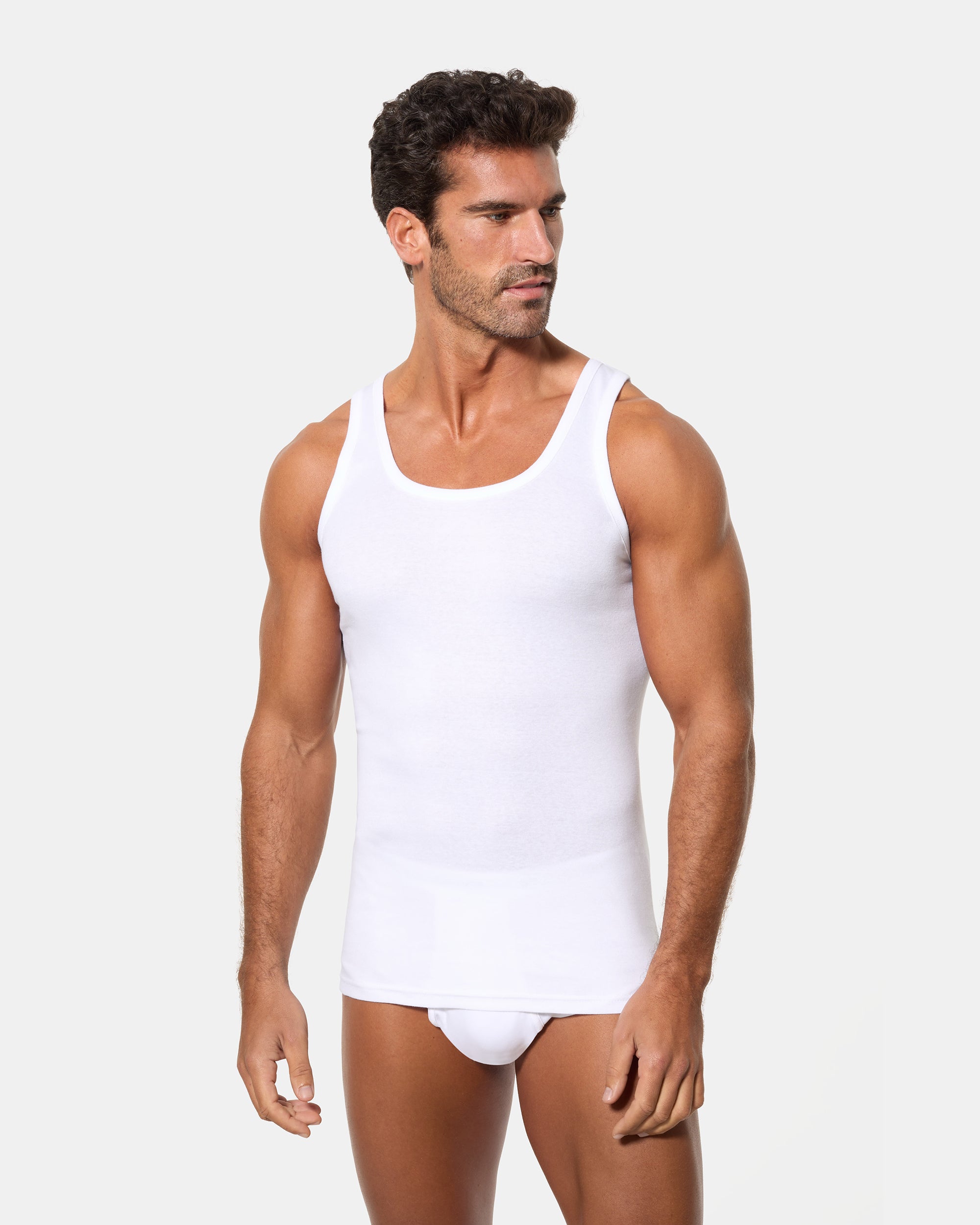 Pack de 2 camisetas de tirantes blancas para hombre, confeccionadas en algodón 100% de alta calidad y tejido canalé 1x1. Este pack ofrece una comodidad excepcional y transpirabilidad, con un ajuste perfecto al cuerpo. Ideal para usar como prenda interior o para actividades cotidianas. Cada camiseta está diseñada para brindarte confort durante todo el día, adaptándose a tu cuerpo como una segunda piel.
