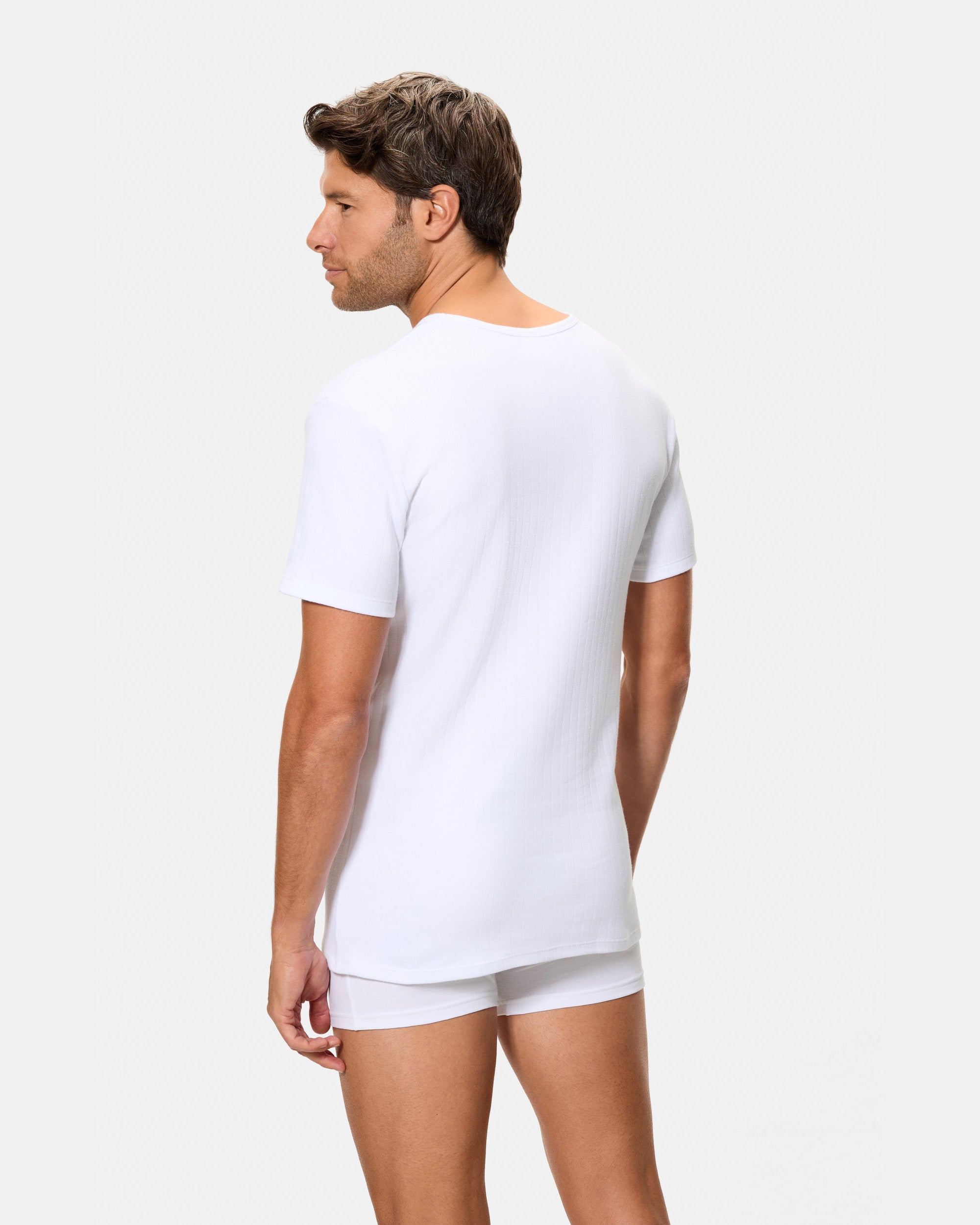 Esta camiseta interior térmica de hombre de manga corta y cuello redondo con acabado canalé está confeccionada en algodón 100%. Su interior afelpado ofrece un extra de calidez y una suavidad agradable, mientras que el tejido interlock desagujado favorece un ajuste cómodo para llevar como prenda interior en climas fríos.